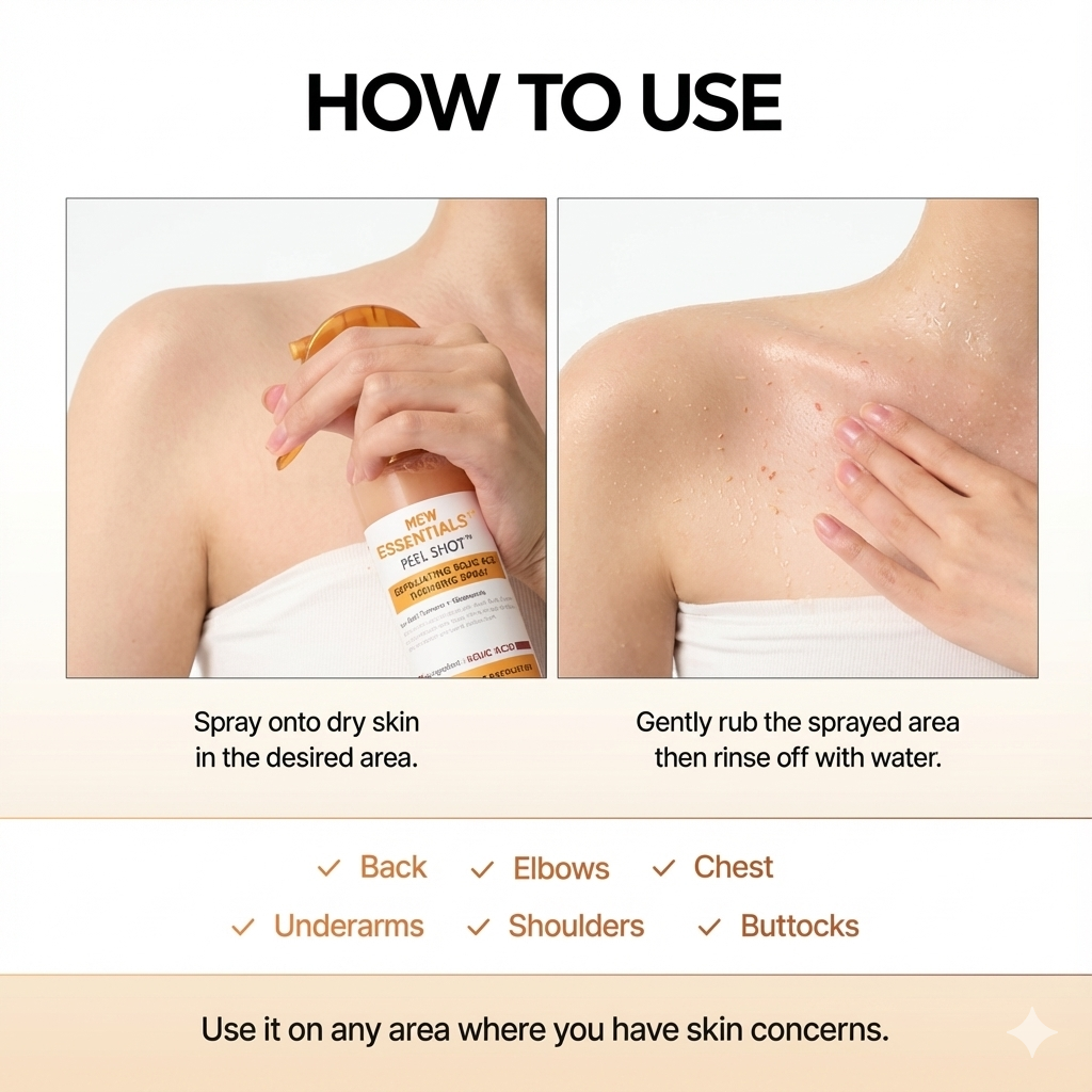 Spray onto dry skin, massage 30–60 seconds, then rinse off in the shower. Pat dry and follow with body moisturizer (and SPF if skin will be exposed).