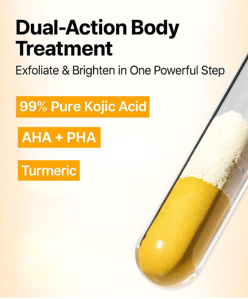 A rinse-off, spray-on body peel that combines Kojic Acid, Turmeric, Niacinamide, and gentle AHA + PHA to smooth KP bumps, clear dull buildup, and visibly even tone—then hydrates with Glycerin + Panthenol (B5).
